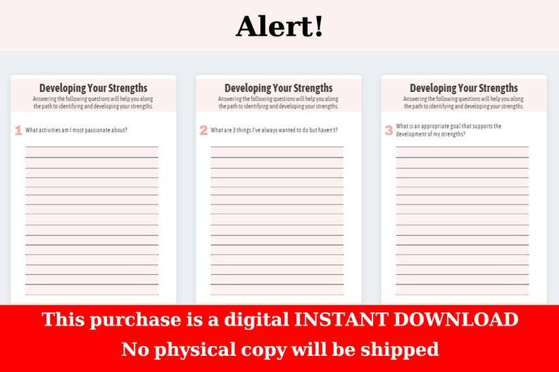 The Developing Your Strengths is a unique, professional resource that will help people develop the skills they need to improve their life. This resource features three worksheets to help you improve your life and achieve your goals. You can use this self-help tool with your clients or sell it as a stand-alone product.