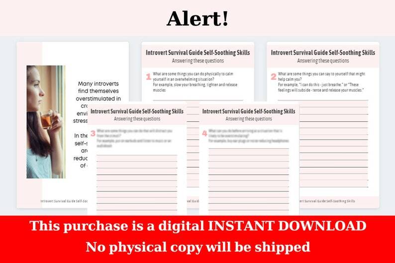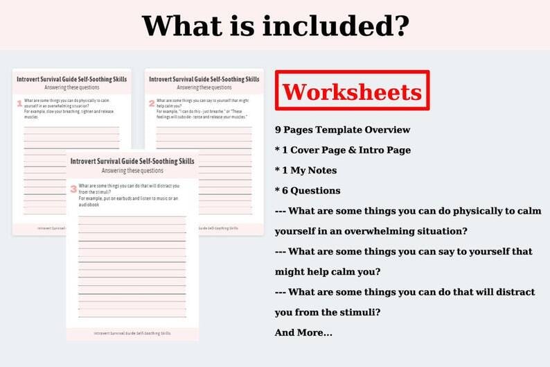 The Introvert Survival Guide Self-Soothing Skills is a unique, professional resource that will help people develop the skills they need to improve their life. This resource features three worksheets to help you improve your life and achieve your goals. You can use this self-help tool with your clients or sell it as a stand-alone product.