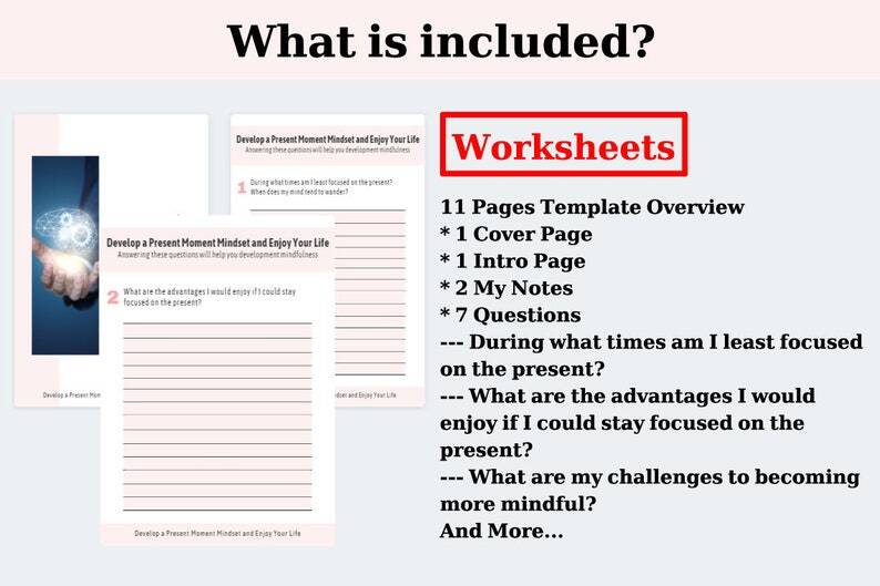 The Develop A Present Moment Mindset is a unique, professional resource that will help people develop the skills they need to improve their life. This resource features three worksheets to help you improve your life and achieve your goals. You can use this self-help tool with your clients or sell it as a stand-alone product.